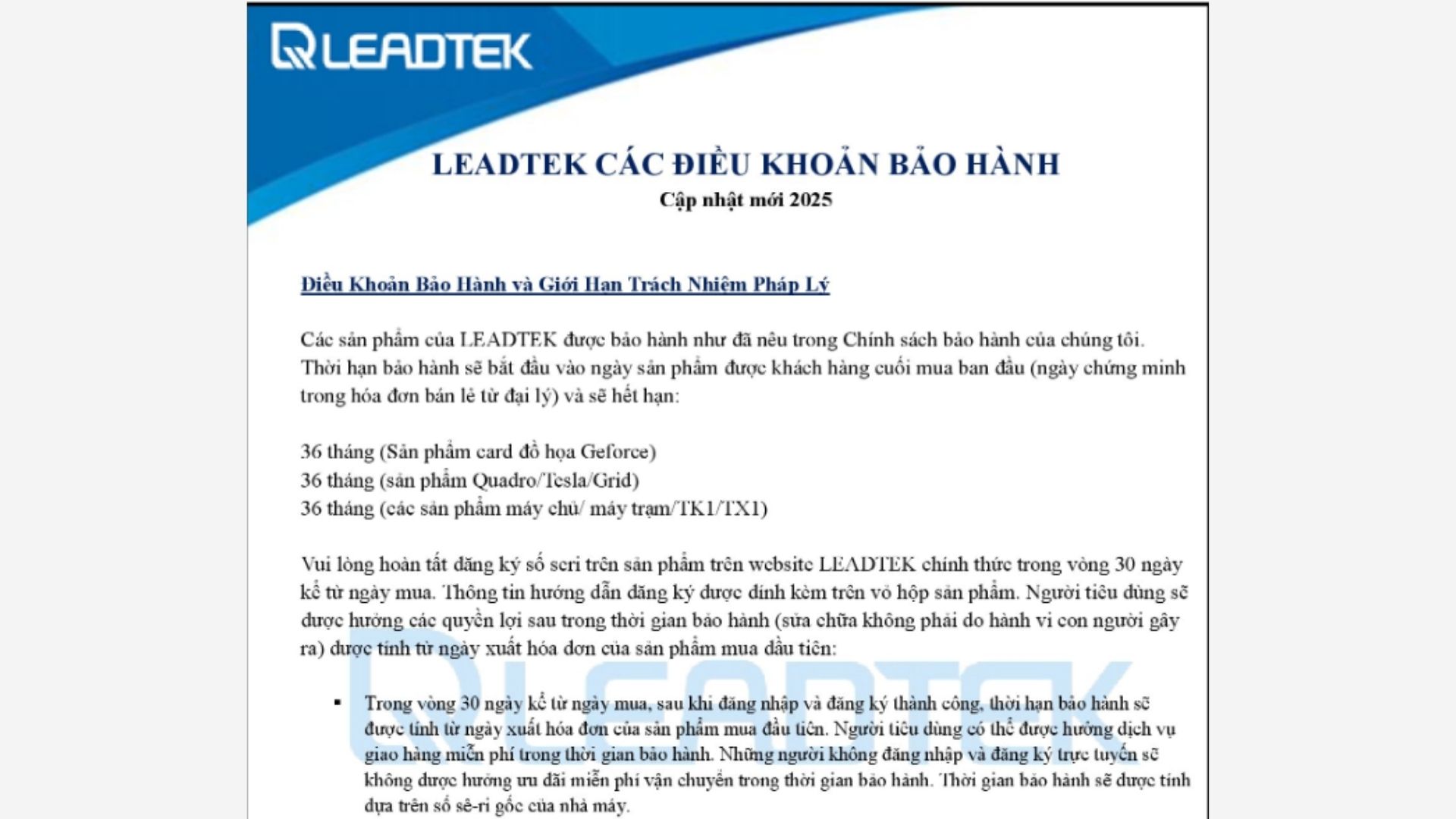 LEADTEK quy định bảo hành cho dòng sản phẩm card đồ họa Geforce là 36 tháng.