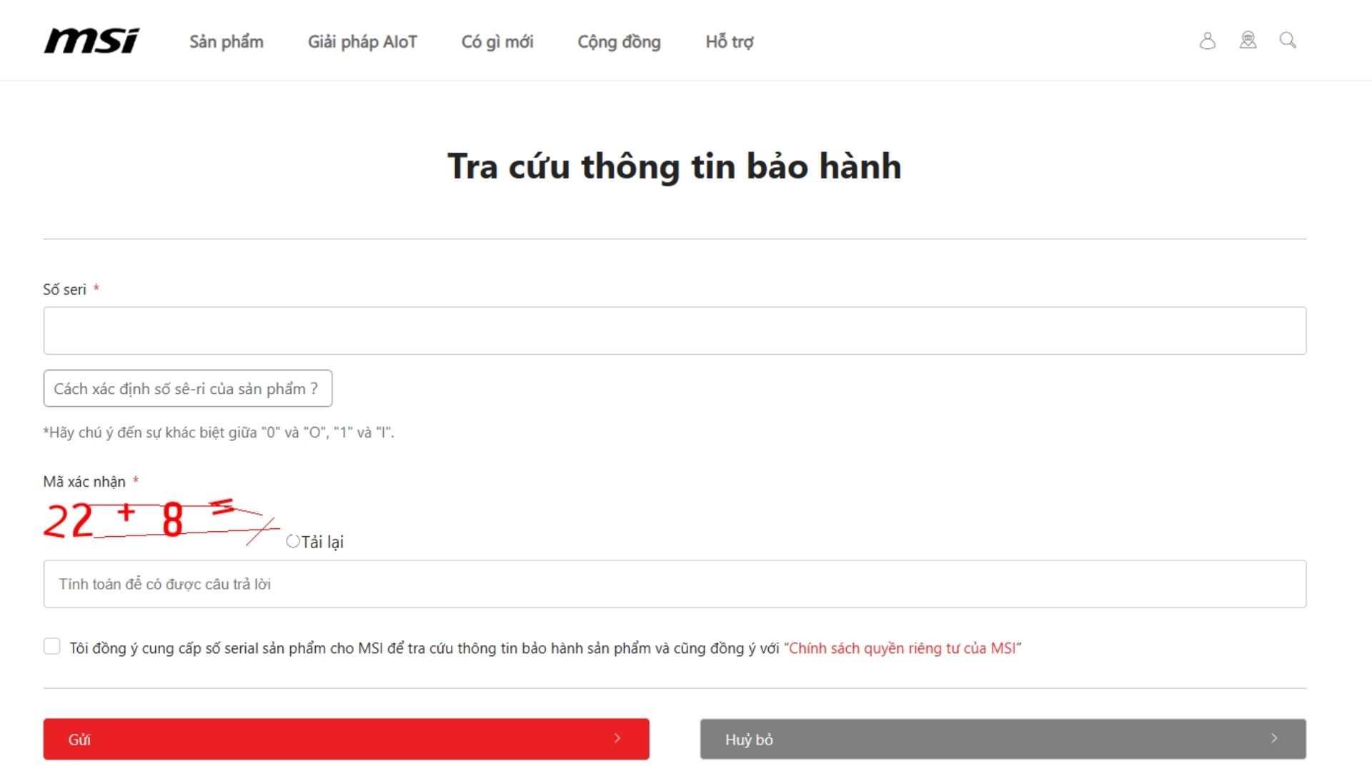 - Điền mã xác nhận là một phép toán và đồng ý với chính sách quyền riêng tư của MSI.