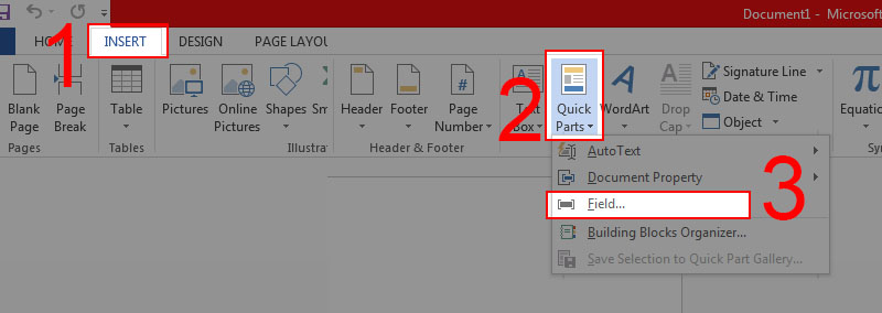 Bước 1: Truy cập Insert, sau đó chọn biểu tượng Quick Parts và chọn Fields.