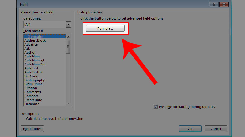 Vào Insert, chọn Quick Parts tiếp theo chọn Fields...