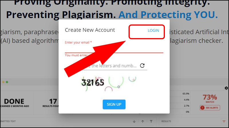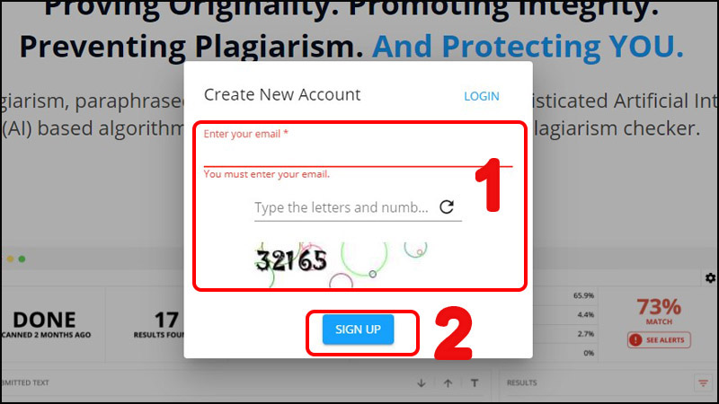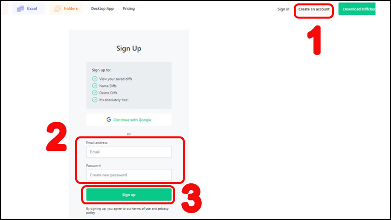 Để có thể lưu nháp hoặc chỉnh sửa những lỗi sai so với bản gốc, bạn nên tạo tài khoản Diffchecker. Để tạo tài khoản, bạn chỉ cần nhấp vào "Create an account", sau đó nhập địa chỉ email và mật khẩu của bạn và nhấn "Sign up".