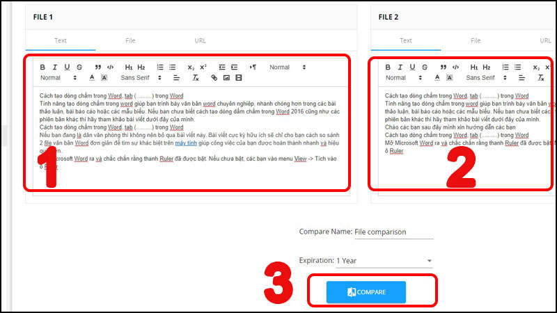 - Bước 3: Sao chép và dán nội dung của 2 tài liệu cần so sánh > Nhấn chọn COMPARE.