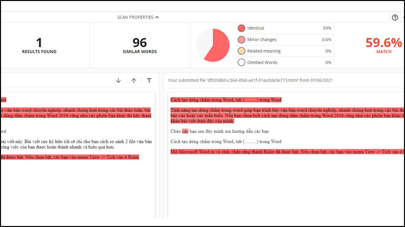 - Bước 4: Chờ vài giây, kết quả sẽ hiển thị với những đoạn văn bản được in đậm (màu đỏ) để chỉ ra sự khác biệt giữa hai tài liệu.