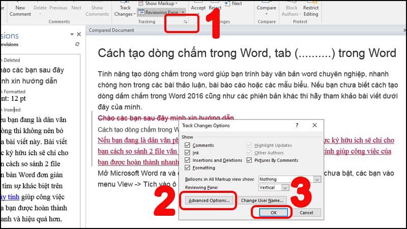 - Sau khi xuất hiện hộp thoại, bạn sẽ có thể lựa chọn một số tùy chọn để thay đổi cách hiển thị so sánh văn bản, chẳng hạn như đường kẻ thông báo chỉnh sửa hoặc màu sắc hiển thị. Nhấn OK để hoàn tất cài đặt.