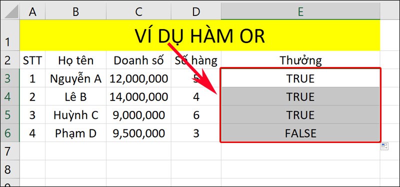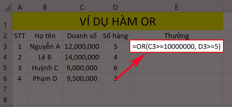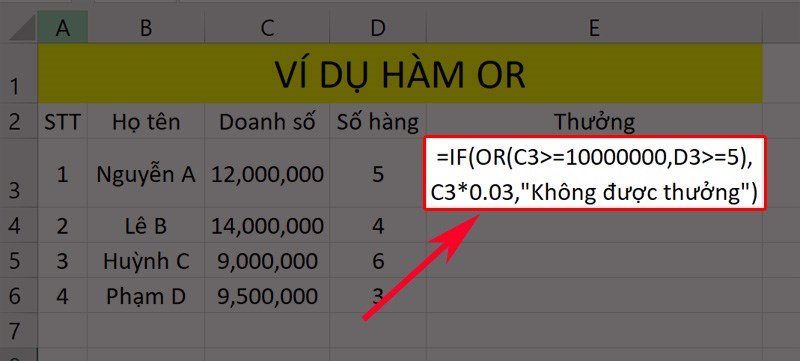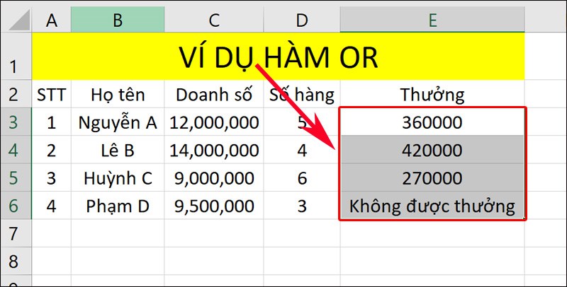 Ví dụ 1: Để kiểm tra điều kiện tính thưởng cho nhân viên trong bảng dữ liệu Excel, bạn có thể sử dụng hàm OR như sau: