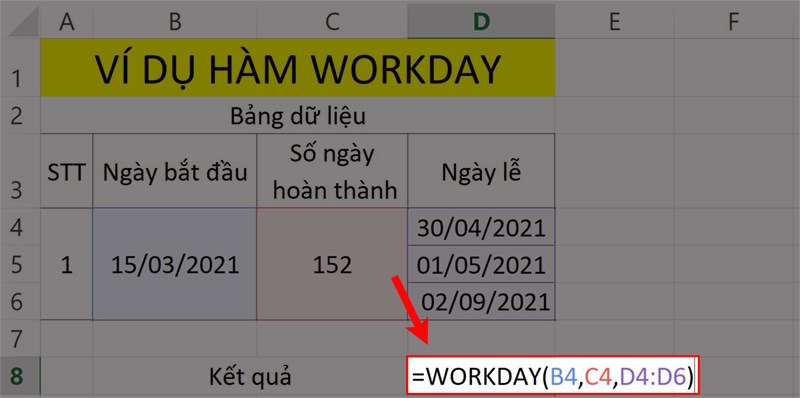 Bước 1: Trong ô tính toán Excel, nhập công thức =WORKDAY(B4, C4, D4:D6)
