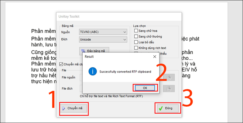 Bước 3: Click vào Chuyển đổi mã > Nhấn OK nếu thấy thông báo "Đã chuyển đổi thành công bảng tạm RTF" (Nếu xuất hiện thông báo "Không thể đọc bảng tạm" thì có thể là bạn chưa sao chép văn bản. Vui lòng thực hiện lại từ đầu) > Nhấn vào Đóng.