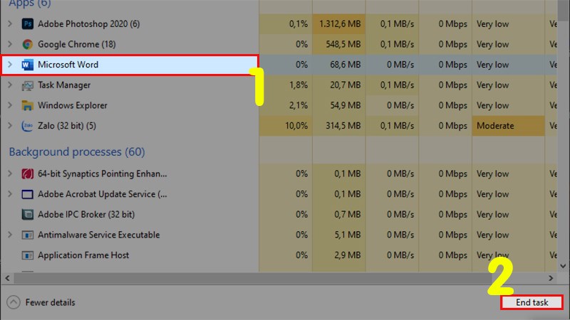 Để thực hiện phương pháp này, bạn có thể tắt file Word từ Task Manager. Dưới đây là quy trình thực hiện:
