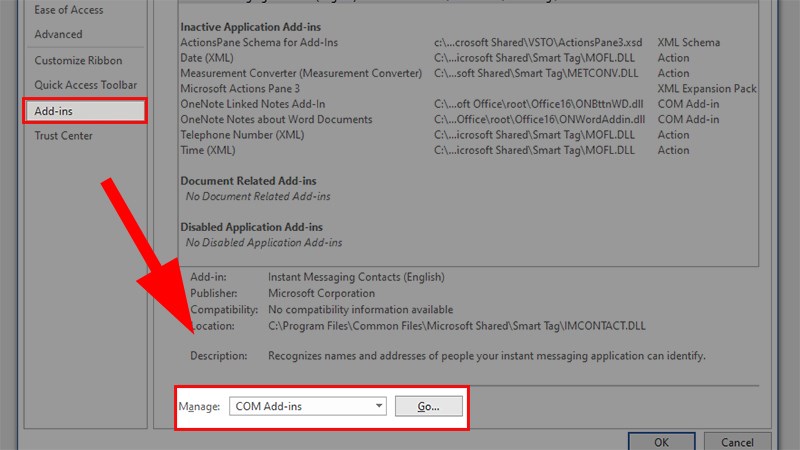 Bước 3: Trong hộp thoại Options hiển thị, điều hướng đến mục Add-ins và chọn nó. Sau đó, đi tới phần quản lý và chọn COM Add-ins. Nhấp vào nút Go.