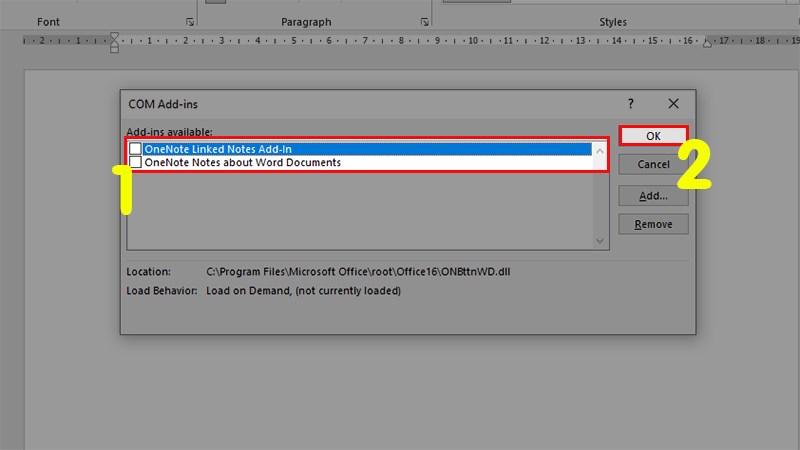 Bước 4: Một hộp thoại Add-ins sẽ xuất hiện. Hãy bỏ chọn các phần mềm bên thứ ba để vô hiệu hóa chúng. Sau đó, nhấn OK.