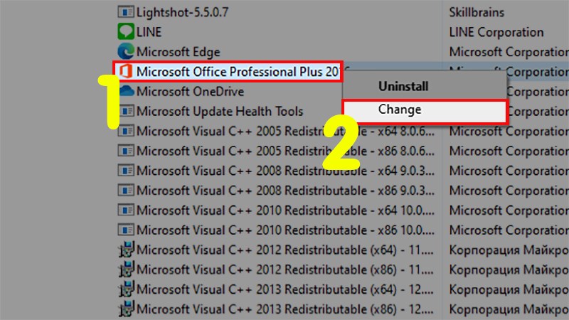 Bước 2: Tìm kiếm phần mềm Microsoft mà bạn muốn sửa > Click chuột phải vào nó > Chọn Change.