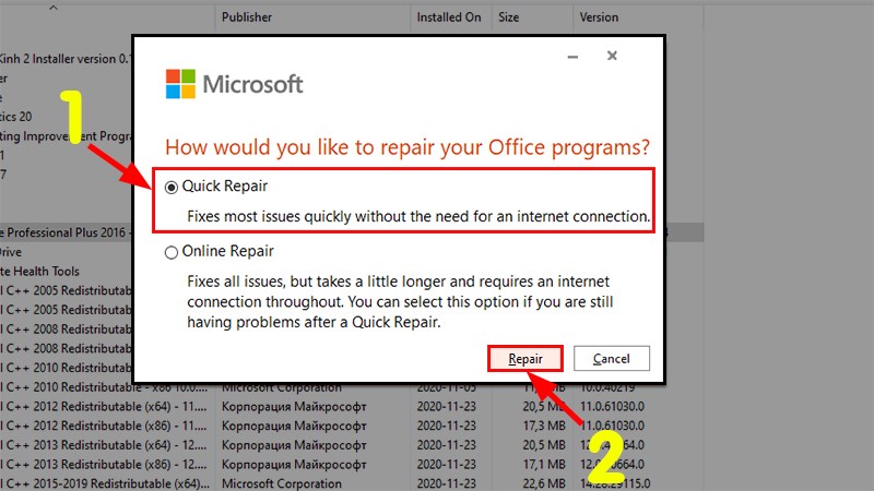 Bước 3: Một cửa sổ mới sẽ hiện ra > Chọn Quick Repair để khắc phục nhanh các lỗi phổ biến hoặc Online Repair để kiểm tra và sửa tất cả các lỗi (Ở đây, chúng tôi sẽ chọn Quick Repair) > Nhấn Repair.