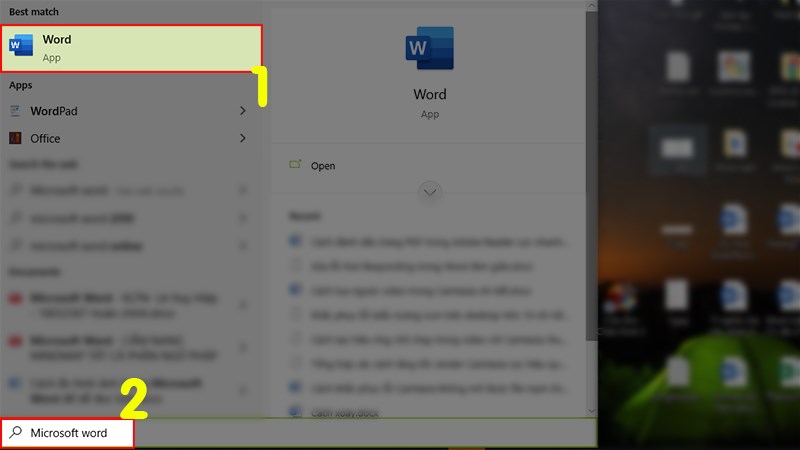 Tìm kiếm phần mềm Word ở thanh tìm kiếm trên Windows
