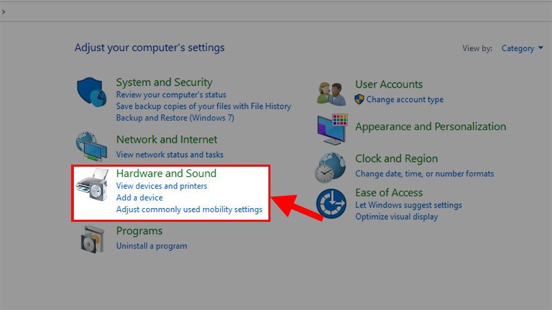 Bước 2: Trong hộp thoại hiển thị, chọn Hardware and Sound.