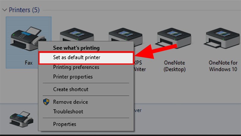 Bước 4: Đi đến phần Printers, chọn một máy in khác ngoại trừ Microsoft XPS Document Writer hoặc Send to OneNote. Nhấp chuột phải vào máy in đó và chọn Set as default printer để đặt làm máy in mặc định.
