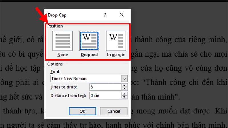 Bước 4: Tại phần Position, bạn có thể chọn vị trí mới cho Drop Cap.