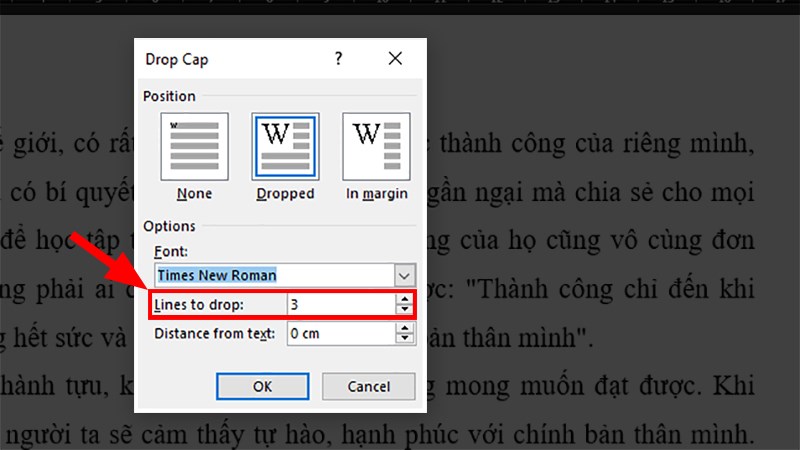 Bước 4: Tại phần Lines to drop, điều chỉnh số dòng hiển thị cho Drop Cap phù hợp.
