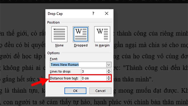 Bước 4: Tại mục Distance from text, bạn có thể điều chỉnh khoảng cách giữa Drop Cap với văn bản cho phù hợp.
