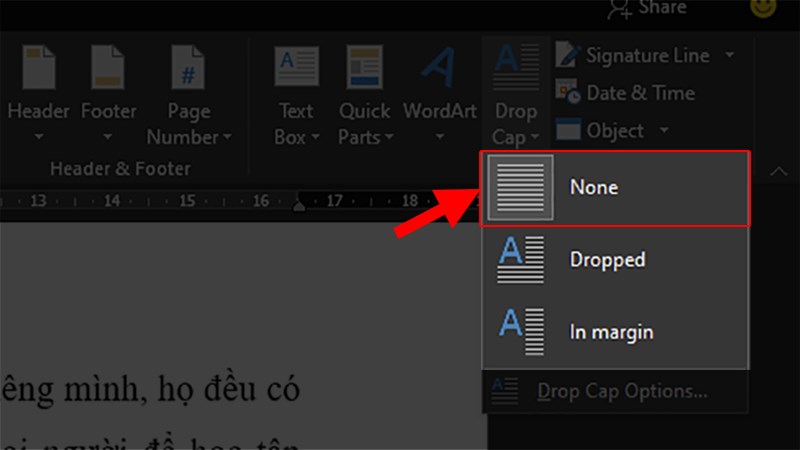 Bước 4: Chọn None để xóa Drop Cap thành công. Lưu ý là chỉ xóa định dạng Drop Cap của chữ cái, chữ cái vẫn được giữ lại.