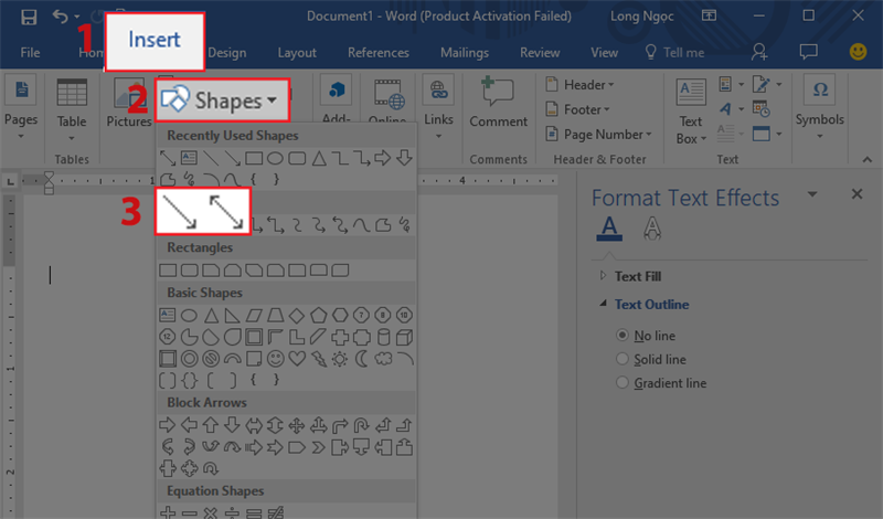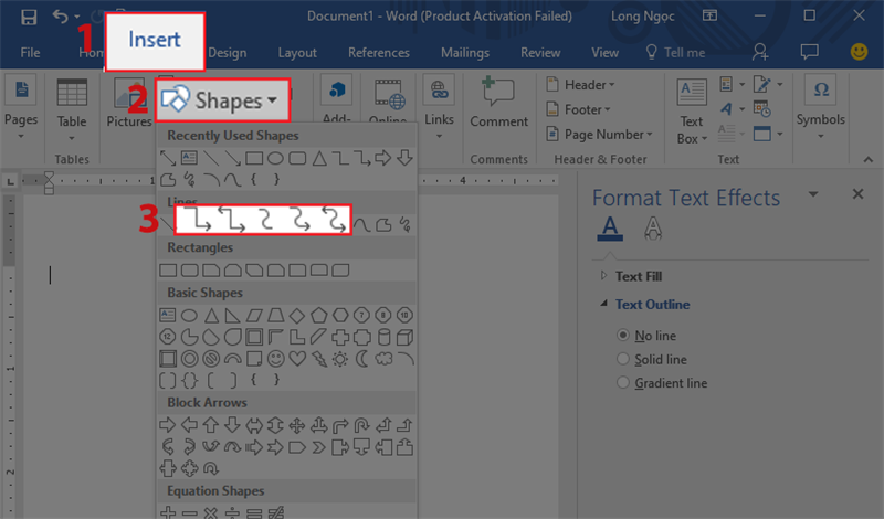 Bước 1: Mở phần mềm Word trên máy tính và chọn Insert. Sau đó, chọn Shapes và lựa chọn hình mũi tên thẳng hoặc mũi tên hai chiều mà bạn muốn vẽ.