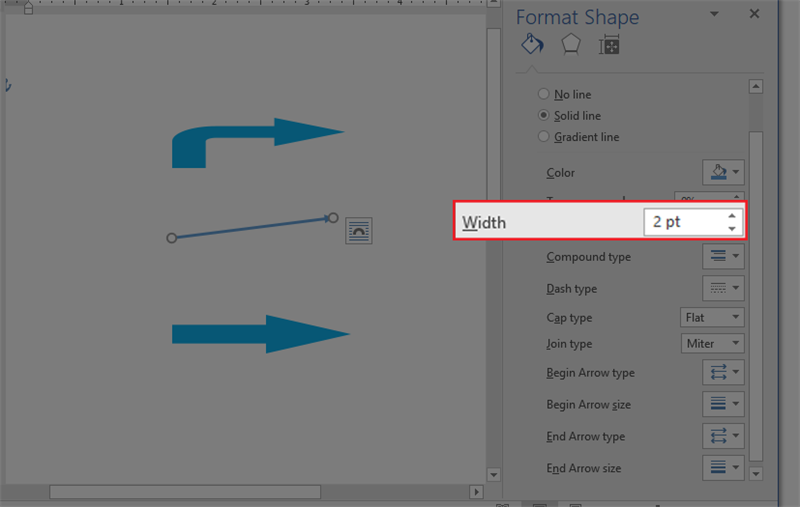 - Để điều chỉnh độ dày của đường viền, nhập giá trị kích thước mong muốn vào ô Width bên phải. Để thay đổi chiều dài của mũi tên, nhấn và giữ chuột trái trên mũi tên, sau đó di chuyển 1 trong 2 nút tròn nằm ở hai đầu mũi tên đến độ dài mong muốn và thả ra.