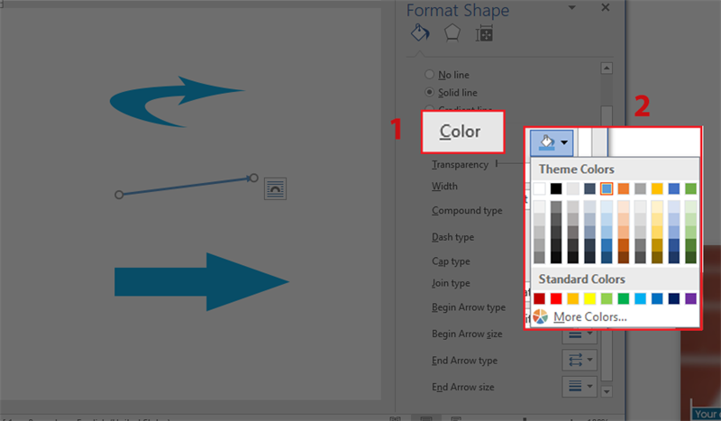 Bước 6: Để thay đổi màu sắc, chọn mũi tên và nhấp vào biểu tượng tam giác ngược trong phần Color (Màu sắc), sau đó chọn màu sắc muốn áp dụng cho mũi tên.