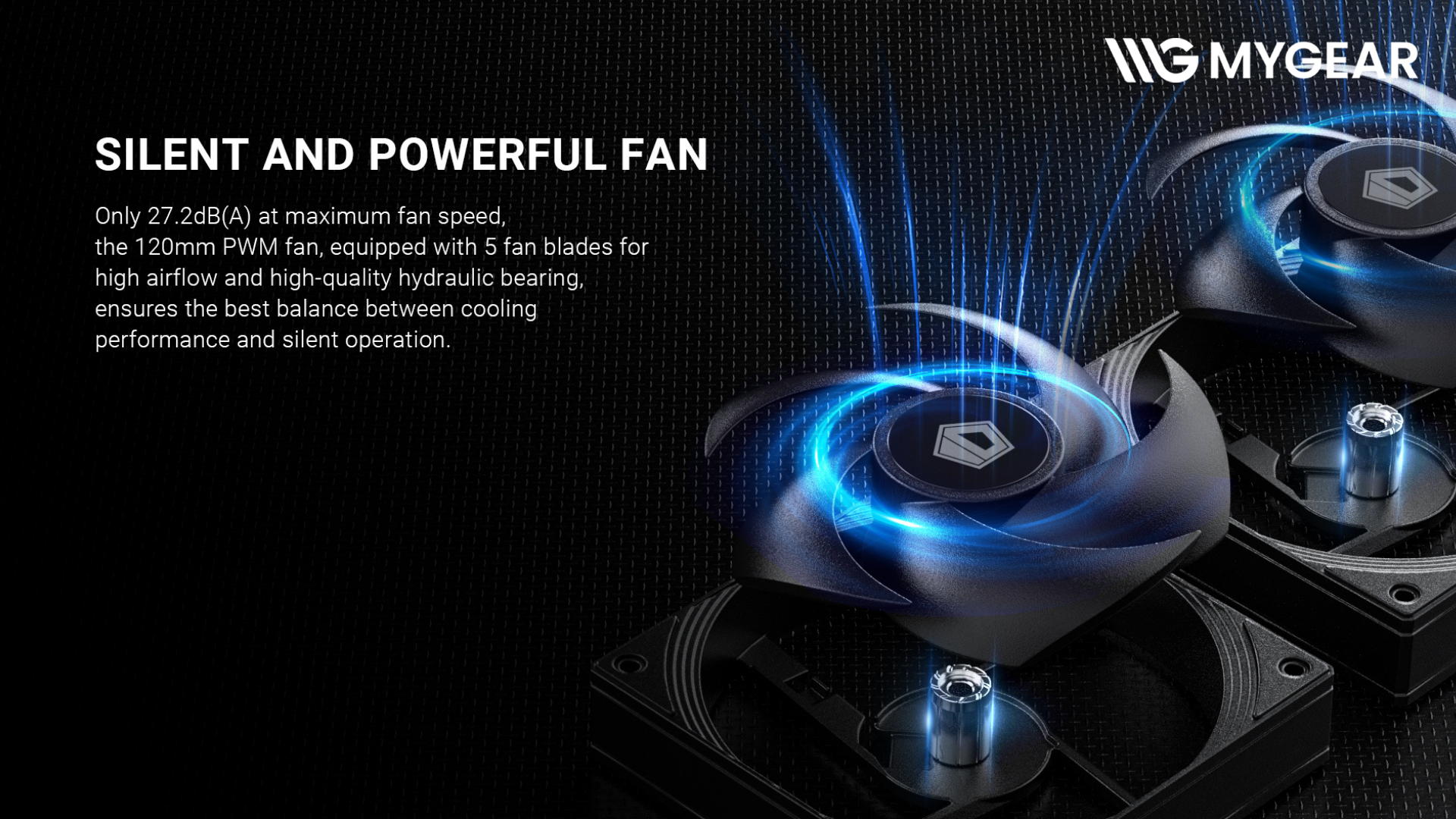 Tản nhiệt khí 2 fan 120mm của ID-COOLING FROZN A620 PRO SE được trang bị 2 quạt 120mm PWM, tốc độ từ 300 đến 2000 RPM, giúp điều chỉnh linh hoạt theo nhiệt độ CPU. Lưu lượng gió tối đa 58CFM đảm bảo khả năng làm mát hiệu quả. Độ ồn tối đa chỉ 27.2dB(A) giúp hệ thống vận hành êm ái, không gây khó chịu khi sử dụng.