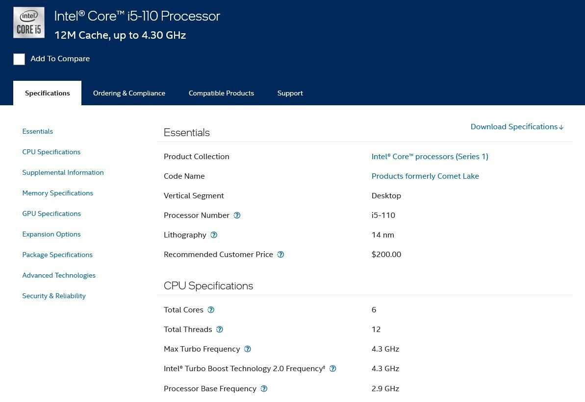 Nó được xây dựng trên kiến trúc "Comet Lake", cùng thế hệ với các bộ xử lý Intel Core thế hệ thứ 10 rất thành công (ví dụ như Core i9-10900K). Điều này có nghĩa là, về mặt công nghệ và hiệu năng, Core i5-110 hoàn toàn tương đồng với một con chip tầm trung của năm 2020, sử dụng socket LGA 1200 đã cũ.