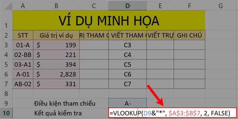 Bước 1: Để thực hiện điều này, bạn hãy nhập công thức =VLOOKUP(D9&"*", $A$3:$B$7, 2, FALSE) vào ô tham chiếu kết quả trong bảng dữ liệu.