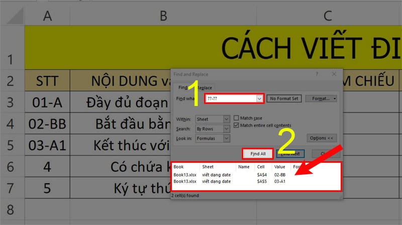Trên bảng tính Excel, bạn hãy nhấn tổ hợp phím Ctrl + F để mở bảng Find and Replace. Tiếp theo, nhập ký tự tìm kiếm ??-?? và nhấn vào nút Find all. Bạn sẽ thấy kết quả tìm kiếm bằng cách thay thế các ký tự đại diện, giống như hình minh họa.