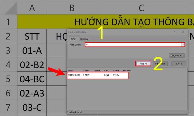 Trong bảng tính Excel, để tìm kiếm một ký tự đại diện, bạn có thể sử dụng tổ hợp phím Ctrl + F để hiển thị bảng Tìm kiếm và Thay thế. Sau đó, nhập ký tự tìm kiếm 4 và nhấn chọn Tìm tất cả. Kết quả tìm kiếm sẽ được hiển thị như minh họa trong hình.