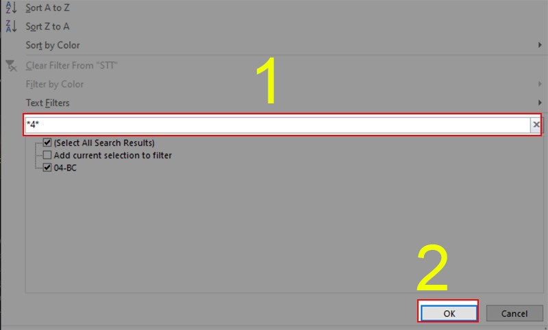 Tương tự như trên, việc sử dụng bộ lọc tự động trong Excel để lọc các số chứa ký tự "4" không gặp bất kỳ vấn đề nào.