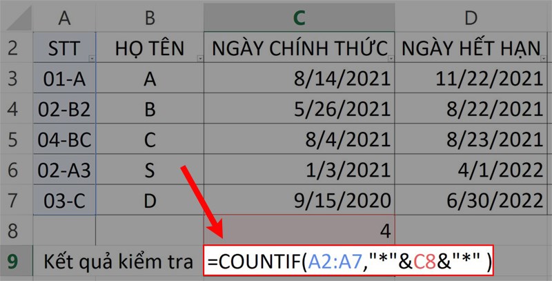 Bước 1: Để thực hiện điều này, bạn nhập công thức =COUNTIF(A2:A7,""&C8&"") vào ô tham chiếu kết quả trong bảng dữ liệu.