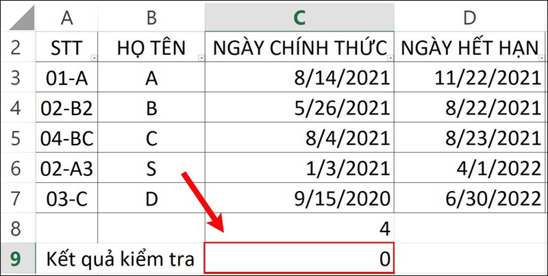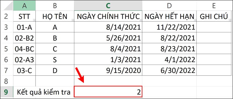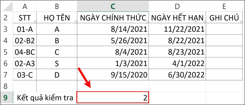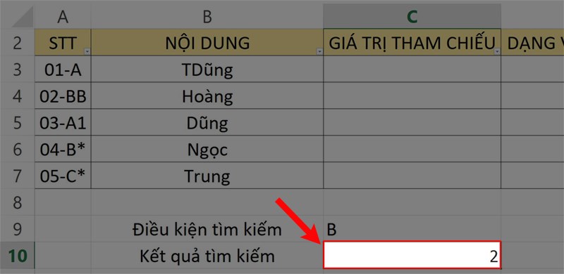 Bước 1: Để thực hiện việc này, bạn hãy nhập công thức =COUNTIF(A2:A7,""&C9&"") vào ô tham chiếu kết quả trong bảng dữ liệu.