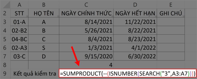 Bước 1: Nhập hàm =SUMPRODUCT(--(ISNUMBER(SEARCH("3",A3:A7)))) vào ô tham chiếu kết quả trong bảng dữ liệu.
