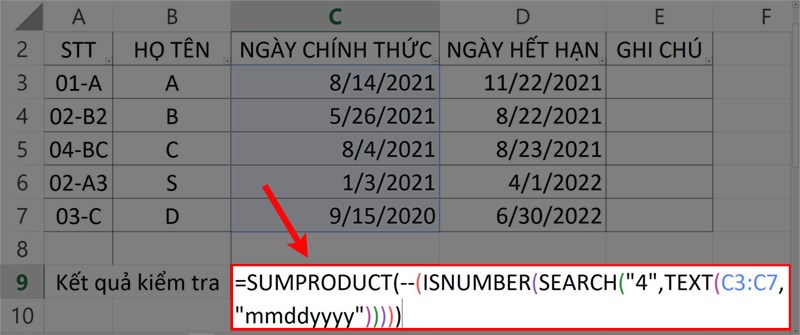Bước 1: Nhập hàm =SUMPRODUCT(--(ISNUMBER(SEARCH("4",TEXT(C3:C7, "mmddyyyy"))))) vào ô tham chiếu kết quả trong bảng dữ liệu.