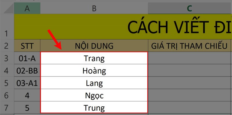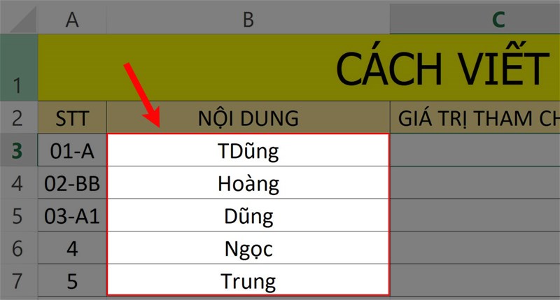 Hãy xem xét một ví dụ với bảng dữ liệu minh họa như hình và nhu cầu tìm kiếm ô chứa ký tự B.