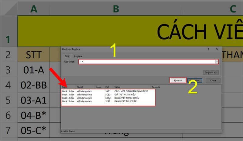 Để tìm một ký tự được Excel xem là ký tự đại diện, có nghĩa là ký hiệu dấu hoa thị hoặc dấu chấm hỏi theo nghĩa đen, bạn hãy thêm ký hiệu ngã (~) vào ký tự tìm kiếm của bạn. Để dễ hình dung, chúng ta có thể nhập ký hiệu ~ * vào ô tìm kiếm.