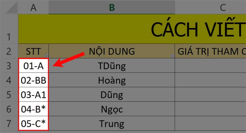 Hãy xem xét một ví dụ với bảng dữ liệu minh họa như hình và nhu cầu tìm kiếm ô chứa ký tự A-.