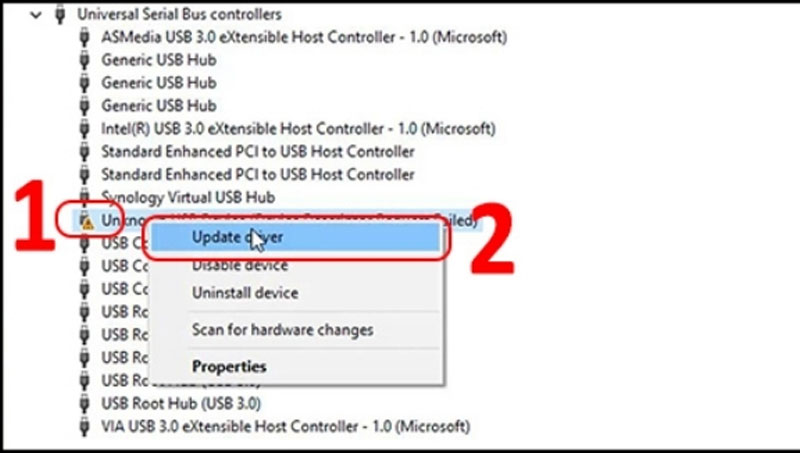 Driver USB bị lỗi, thiếu hoặc không tương thích là nguyên nhân phổ biến khiến máy tính không nhận USB. Các bước khắc phục: