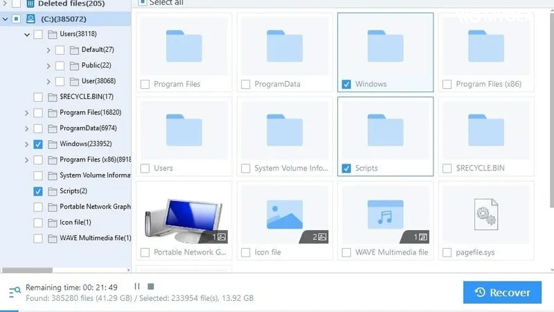- Khi quét xong, chọn file cài đặt và dữ liệu liên quan, nhấn Recover, lưu vào ổ khác.