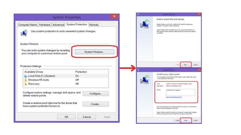 - Chọn System Restore, chọn điểm khôi phục gần nhất, nhấn Finish.