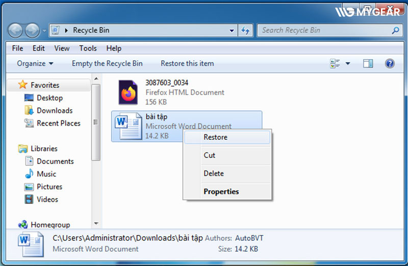 1. Hướng dẫn chi tiết các bước phục hồi file trực tiếp từ thùng rác (Restore)
