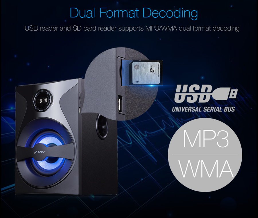 Không chỉ dừng lại ở phát nhạc từ thiết bị kết nối, loa FENDA 2.1 F380X còn hỗ trợ phát nhạc từ thẻ nhớ SD, USB và thậm chí là FM Radio. Điều này biến F380X thành một thiết bị giải trí đa năng, phù hợp cho cả người dùng cá nhân và gia đình.