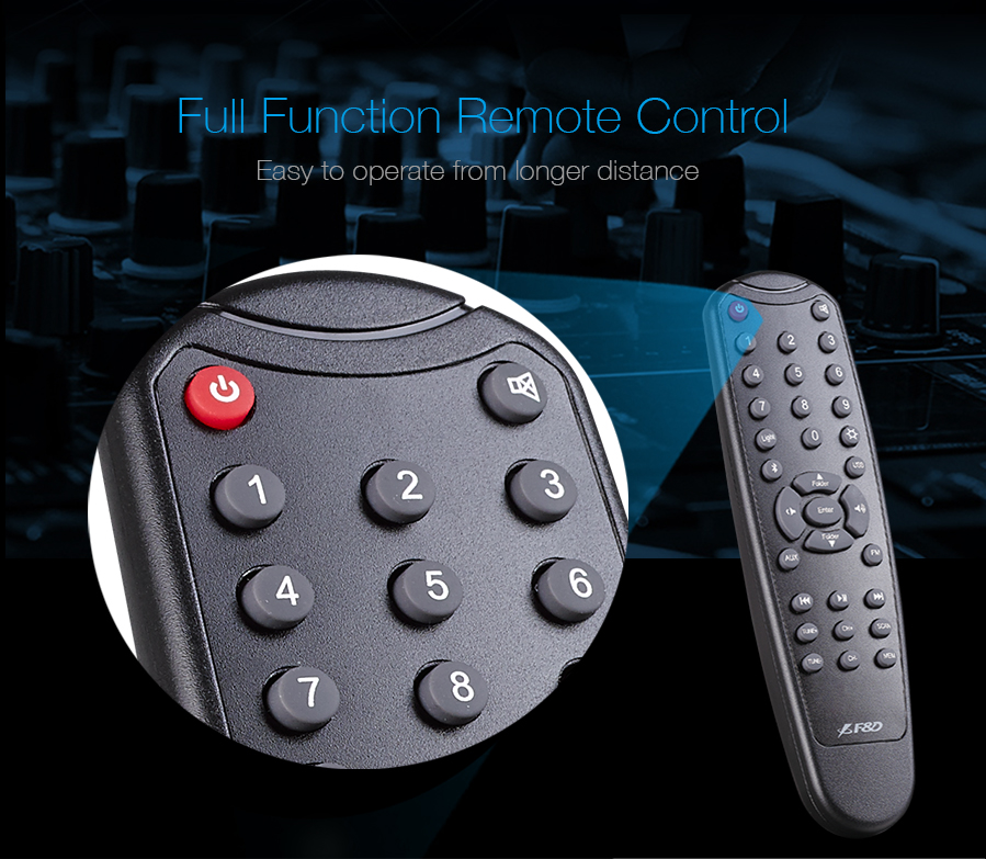 Người dùng có thể dễ dàng điều chỉnh âm lượng, chuyển bài, chọn chế độ phát nhạc hoặc đổi nguồn đầu vào thông qua remote control từ xa hoặc nút điều khiển tích hợp trên loa FENDA F380X 2.1. Sự linh hoạt của điều khiển từ xa mang đến trải nghiệm sử dụng thuận tiện, nhất là khi bạn đang ngồi xem phim hoặc giải trí tại khoảng cách xa.