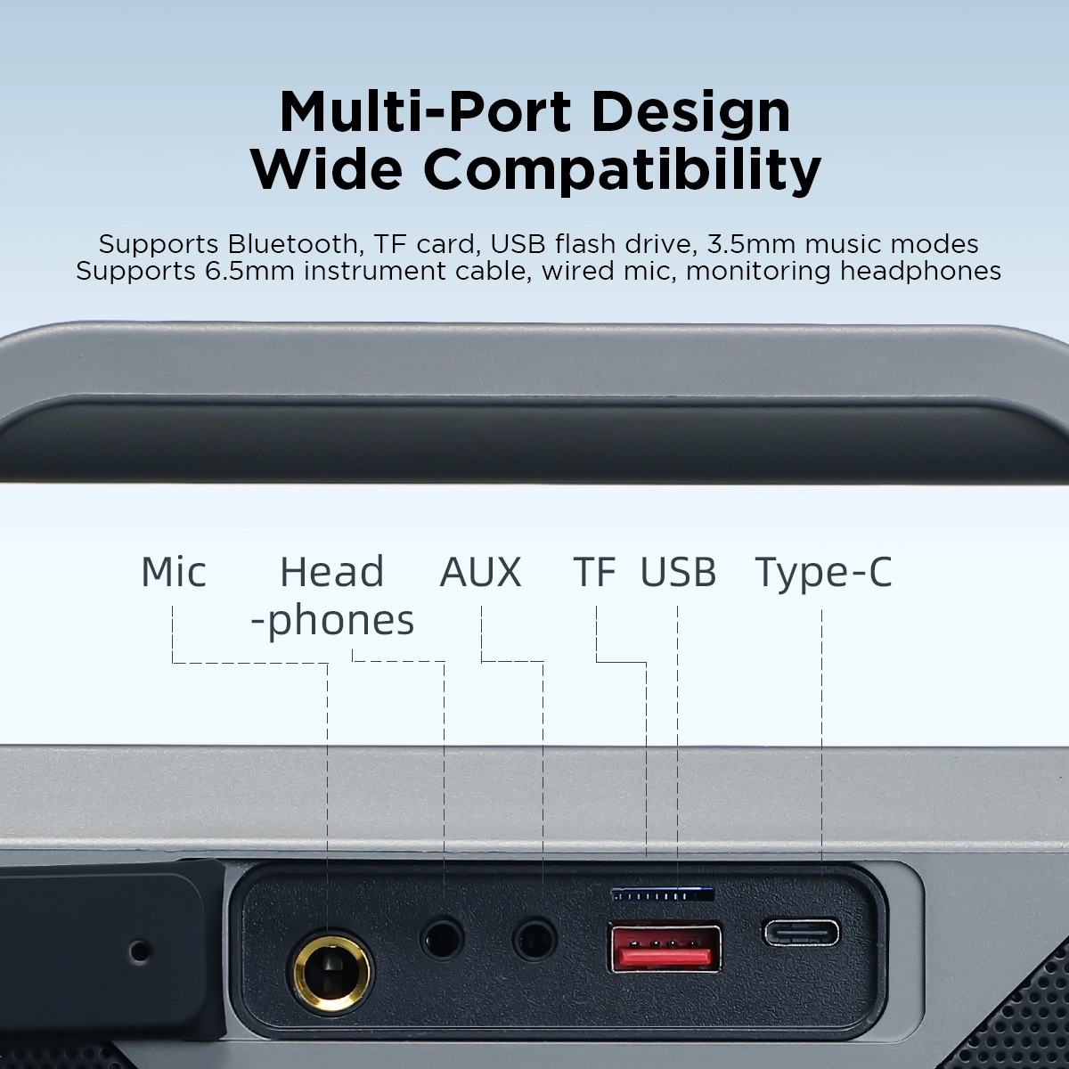 Mic, Headphone, Aux, TF, USB, Type-C |