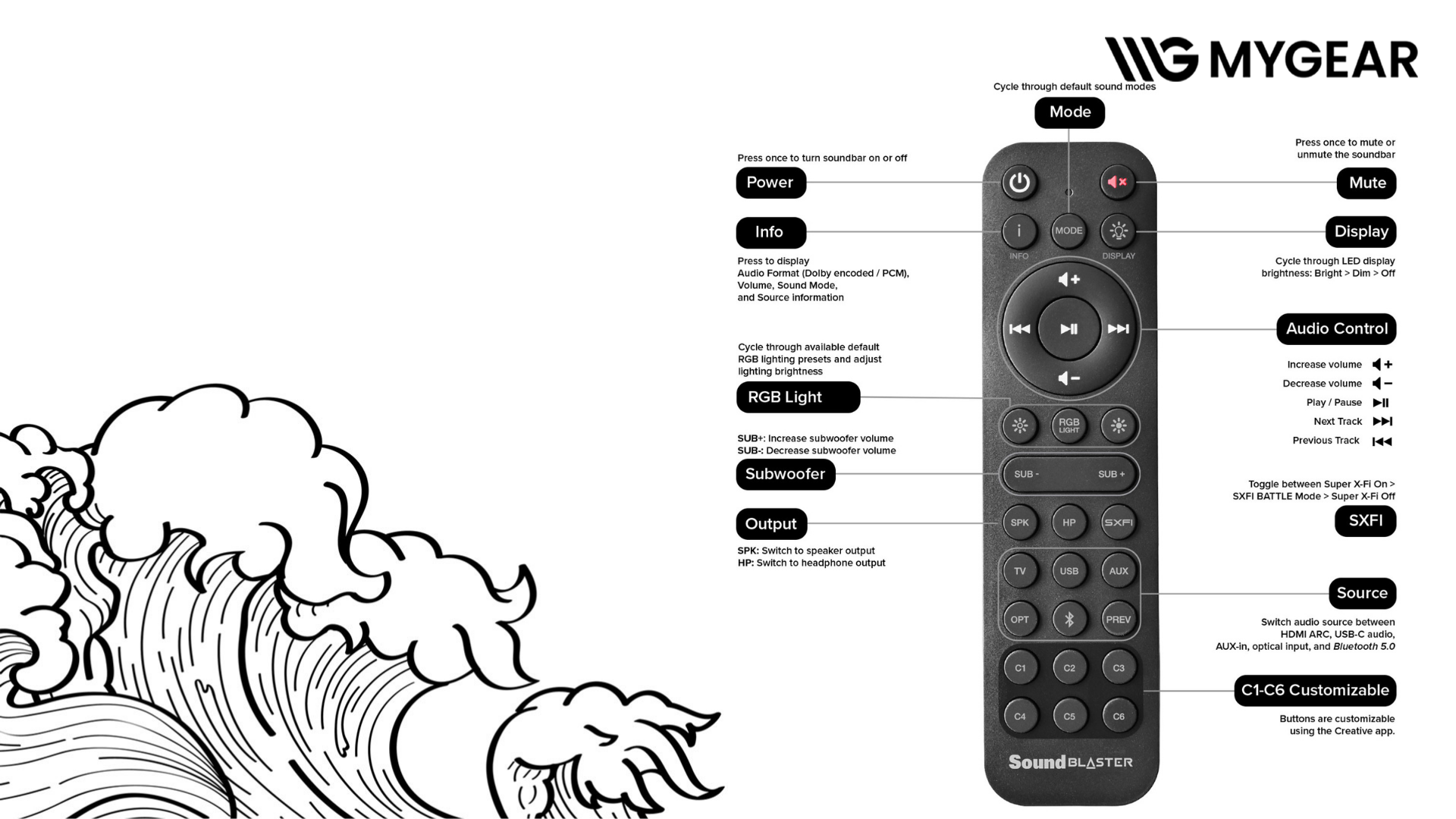 | Cổng kết nối | Cắm điện AC, DC-in, Subwoofer-out, HDMI 2.1, USB-in, Optical-in (TOSLINK), Aux-in, Headset-out, SXFI-out |