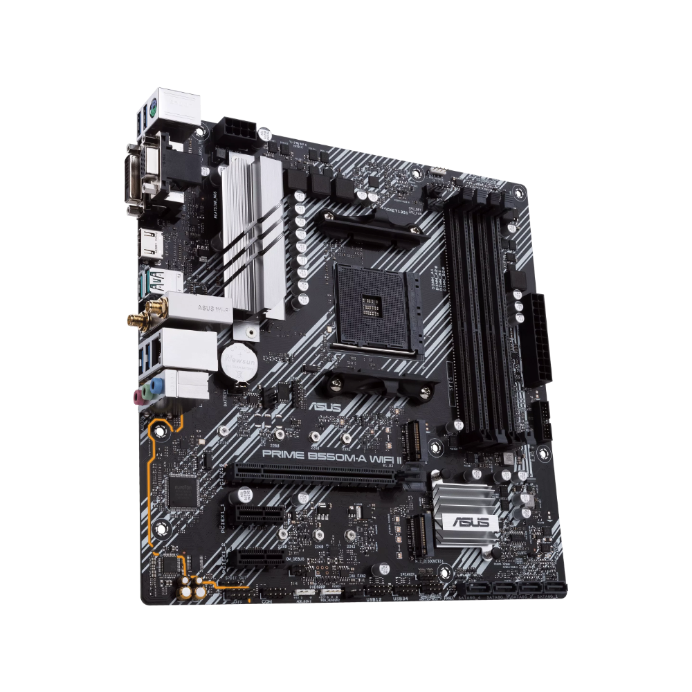 Mainboard ASUS PRIME B550M-A WIFI II sử dụng chipset B550 hiện đại của AMD, hỗ trợ đầy đủ các dòng CPU Ryzen thế hệ 3, 4 và 5 (AM4), bao gồm cả Ryzen 5000 Series. Chipset B550 mang đến khả năng tương thích tuyệt vời với PCIe 4.0 chuẩn giao tiếp siêu tốc giúp tối ưu băng thông cho card đồ họa và ổ cứng SSD NVMe, cho tốc độ đọc/ghi vượt trội. Đi cùng thiết kế mạch VRM cao cấp, tản nhiệt nhôm lớn và công nghệ DIGI+ VRM độc quyền, bo mạch chủ đảm bảo nguồn điện ổn định, duy trì hiệu năng mạnh mẽ cho CPU trong mọi điều kiện hoạt động.