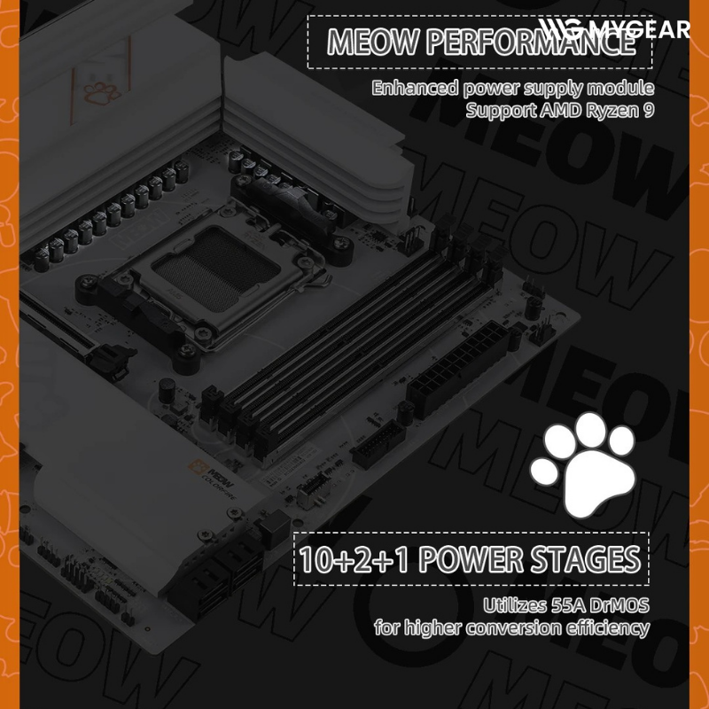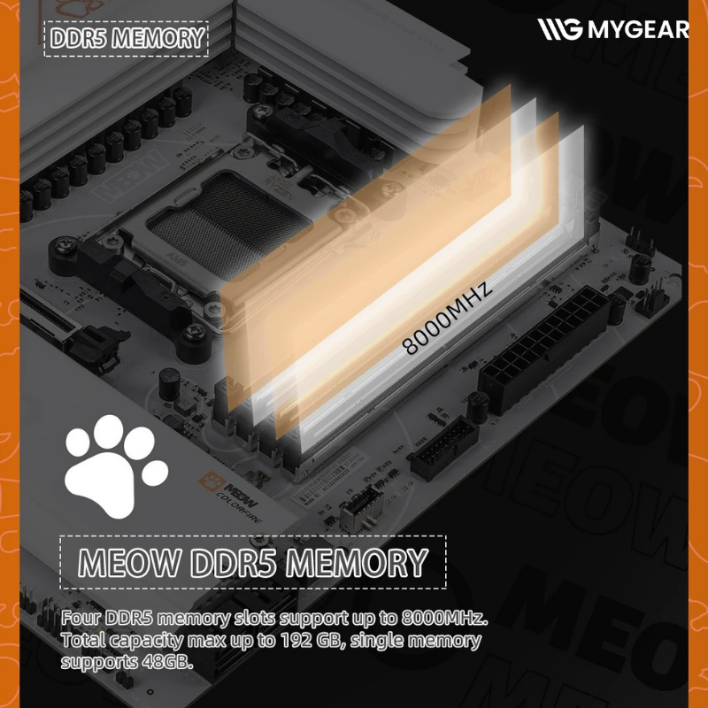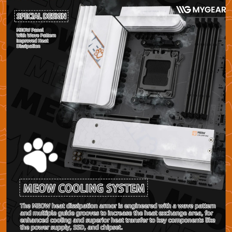 Mainboard Colorful B850M-MEOW gây ấn tượng ngay từ cái nhìn đầu tiên với phong cách Colorful Meow trẻ trung, họa tiết tinh tế và tông trắng đồng bộ. Thiết kế giúp bo mạch dễ dàng kết hợp với case trắng, tản nhiệt AIO trắng và các linh kiện RGB để tạo nên một bộ PC vừa gọn gàng vừa nổi bật.