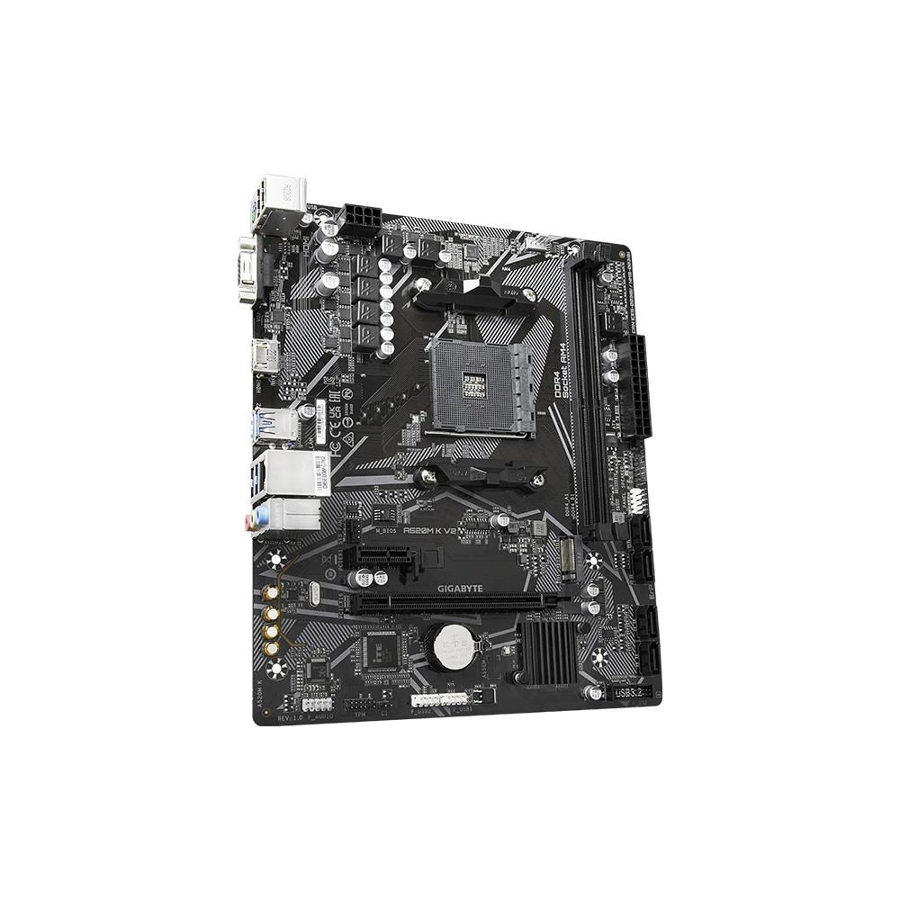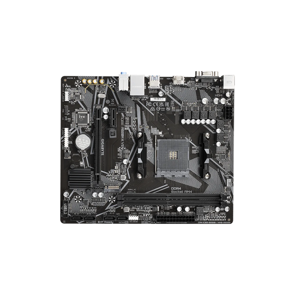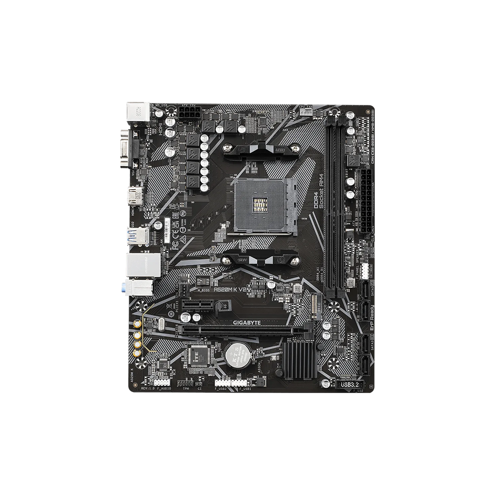 Mainboard hỗ trợ Ryzen 5000 như Ryzen 5 5600, Ryzen 7 5700G, Ryzen 5 4600G hay các dòng Ryzen 3000, giúp người dùng dễ dàng xây dựng cấu hình PC linh hoạt theo ngân sách. Với socket AM4, Gigabyte A520M K V2 đáp ứng tốt nhu cầu nâng cấp CPU trong phân khúc phổ thông.
